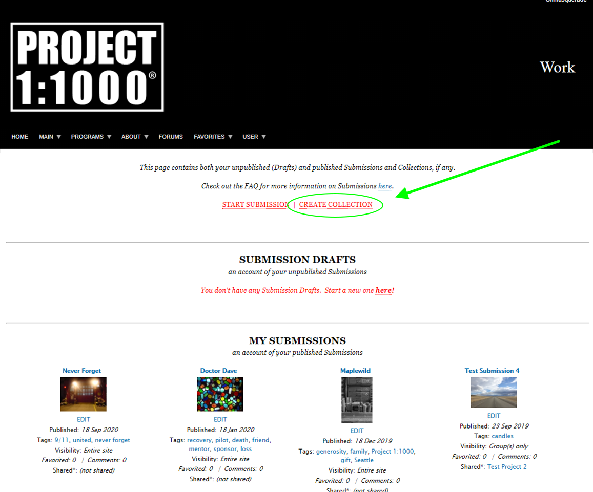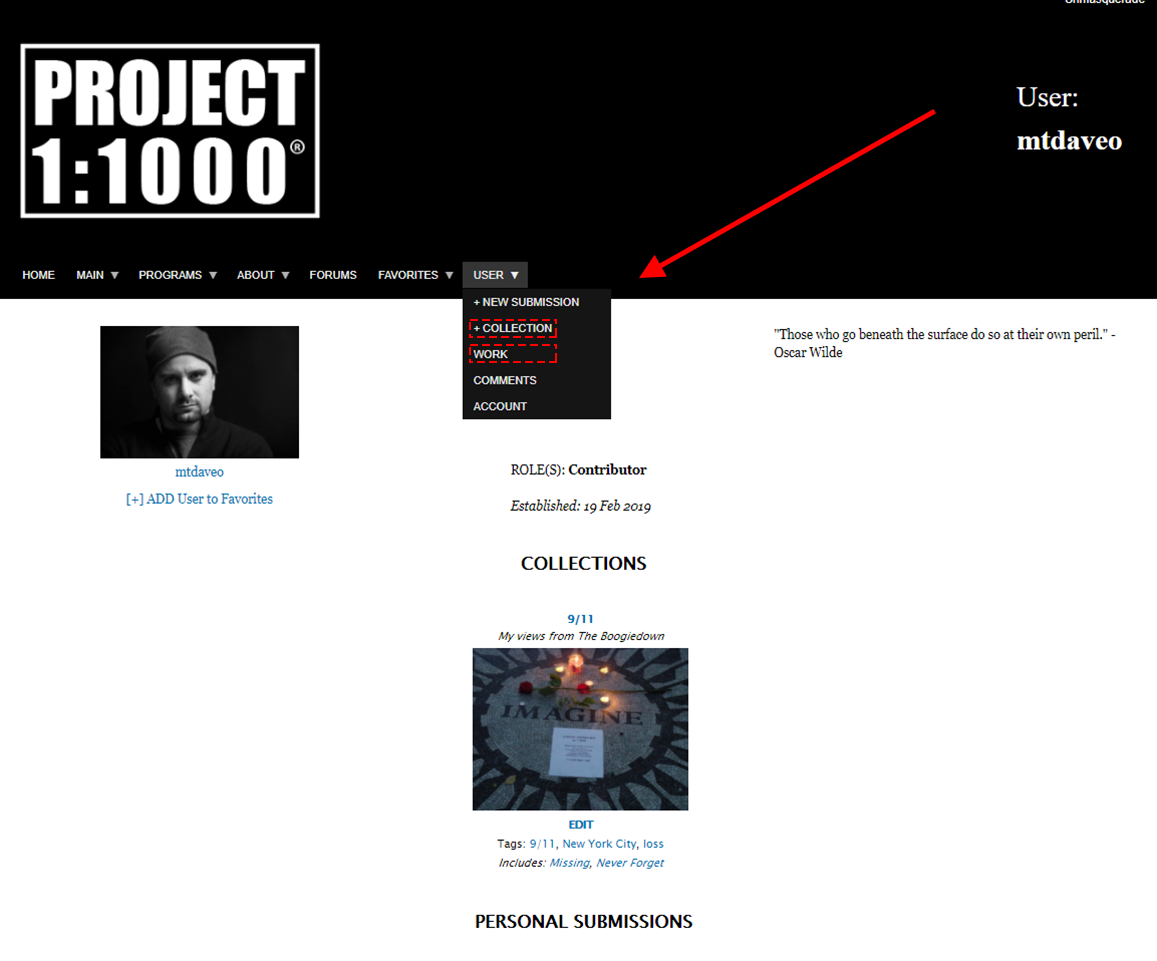 After your Submission(s) has/have been published, either choose USER > + COLLECTION...